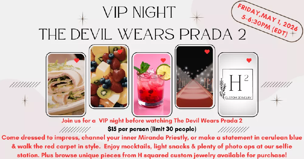 Come dressed to impress, channel your inner Miranda Priestly, or make a statement in cerulean blue & walk the red carpet in style. Enjoy mocktails, light snacks & plenty of photo ops at our selfie station. Plus browse unique pieces from H squared custom jewelry available for purchase!
